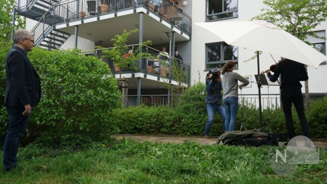 Zusammen mit den Bewohnern auf den Balkonen des Avendi-Altenpflegeheims genießt Landrat Ulrich Krebs (links) das Ständchen von Ferdinand Mauer und Fanny Staeger (unter dem Schirm). Foto: Hochtaunuskreis