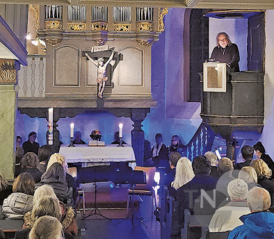 Pfarrer Herbert Lüdtke gibt zwischen den musikalischen Eindrücken von der Kanzel herunter einige Denkanstöße zu vielen aktuellen Themen.Foto: nel