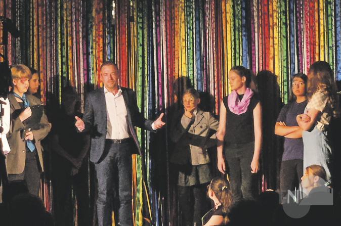 Bürgermeister Steffen Bonk erzählt bei seinem Gastauftritt, dass alle Sichtweisen in der Schule berücksichtigt werden müssen, dass Kinder jedoch ein Recht auf Freizeit haben und ohne großen Druck aufwachsen sollten. Die anderen Performer goutieren das.Foto: nel