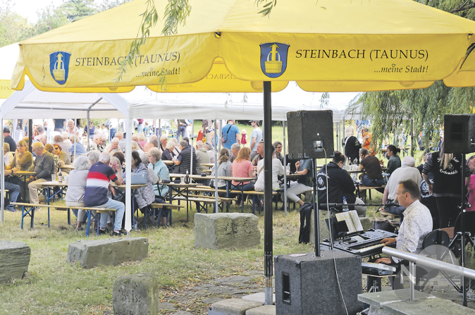 In angenehmer Stimmung, mit einem leichten Lüftchen und unter den Bäumen am kleinen Bach, ließ sich der Sonntag von 11 bis 16 Uhr angenehm verbringen. Auch der beliebte Familientag wurde in die Veranstaltung integriert – es gab eine Hüpfburg, eine Trampolinstation, eine Kistenrutsche, Kinderschminken und auch ein Gewinnrad am Stand des Regionalparks RheinMain. Und noch einen Anlass hatte das kleine Fest. Es wurde gebührend der Ausklang von Steinbach OpenAir gefeiert, das in diesem Jahr bereits vorbei ist und den Bürgern wie üblich große Freude bei einem breiten Angebot von kulturellen Angeboten bereitet hat.