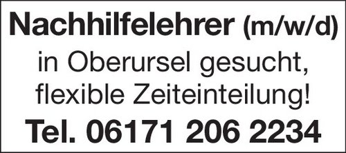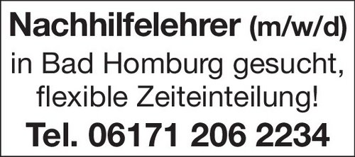 Diese Angebote finden Sie auch in den gedruckten Lokalzeitungen der Bad Homburger Woche, Friedrichsdorfer Woche, Oberurseler Woche, Steinbacher Woche, Kronberger Bote, Königsteiner Woche, Kelkheimer Zeitung, Eschborner Woche, Schwalbacher Woche und Bad Sodener Woche.