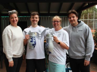Sulzbach (gs) – Seit einem Jahr fährt der Tennisverein Sulzbach (TVST) bei vereinsinternen Wettbewerben getränkemäßig zweigleisig. Denn was seit 34 Jahren für Bierliebhaber der „Kölsch-Cup“ ist, ist für Apfelweingenießer der neue „Äppler-Cup“, der im Vorjahr seine Premiere feierte und jetzt die zweite Auflage erlebte. Beim „Kölsch-Cup“ wird das gezapfte Altbier stilgerecht aus 0,2-Liter-Gläschen getrunken. Diese Gewinner bekommen als Pokale die Kölner Witzfiguren „Tünnes und Schäl“. Beim „Äppler-Cup“ wird der Ebbelwoi in großen gerippten 0,5-Liter-Gläsern ausgeschenkt. Als Siegestrophäen …